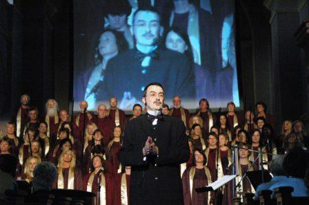 | Leiter Jörg Wöltche vor seinem eigenen Großbildschirm-Konterfei | Jedes Lied: auch eine Verkündigung des Glaubens |