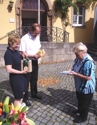 KV-Vertrauensfrau Wößner überreicht die Gaben |                           Gruppenbild: Begrüßende und Begrüßte |