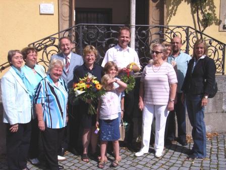 Schweinfurt. Seit Mo., dem 21. August 2006, ist er samt Familie in Schweinfurt ansässig. Schon vor Morgengrauen zogen schwere Umzugsgespanne mit Deggendorfer Kennzeichen ihre Runde auf dem Martin-Luther-Platz. Bald herrschte reger Ausladebetrieb. Um 11.00 Uhr empfing Ehepaar Bruckmann, das ebenfalls eine lange nächtliche Fahrt hinter sich hatte, mit zweien ihrer vier Kinder vor dem Dekanat ein 10-köpfiges Begrüßungskomitee. Vertreterinnen und Vertreter des Kirchenvorstandes St. Johannis und des Evangelischen Frauenbundes Schweinfurt hatten sich eingefunden, um den neu Zugezogenen traditionell Brot und Salz zu überreichen und außerdem ihnen speziell mittels Bocksbeutel, Stadtkarte und Theaterprogramm noch mehr Lust auf Schweinfurt zu machen. Inzwischen ist der Einzug abgeschlossen, aber das nachts lange brennende Licht im Dekanat lässt unschwer darauf schließen, dass noch längst nicht alles ausgepackt und an seinem vorgesehenen Platz ist. Wir wünschen Ehepaar Bruckmann ein gutes Eingewöhnen und auch noch einige erholsame Urlaubstage.
