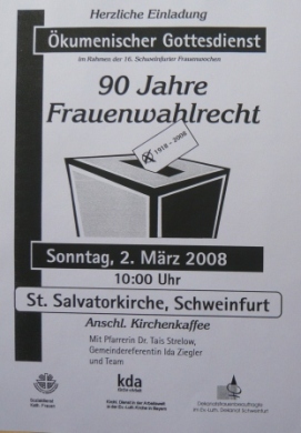 Schweinfurt, 2. März 2008. Ein ökumenischer Gottesdienst in der St. Salvatorkirche Schweinfurt widmete sich der Entwicklung des Frauenwahlrechtes in Europa, besonders in Deutschland. Vorbereitet wurde diese Gemeinschaftsveranstaltung im Rahmen der 16. Schweinfurter Frauenwochen vom Sozialdienst Kath. Frauen, dem Kirchlichen Dienst in der Arbeitswelt (kda) und von den Dekanatsbeauftragten im Ev.-luth. Dekanat Schweinfurt.