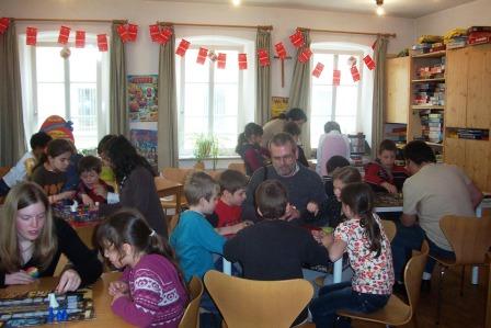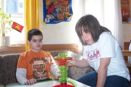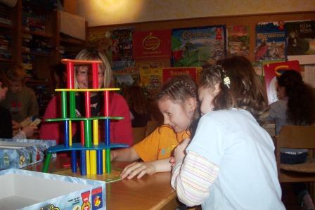 Dieses Jahr begannen wir - die evangelische Jugend - wieder einmal an einem Montag (28.04.2008) und das Haus füllte sich jede Stunde mit Schulklassen. Die Spieleerklärer brachten geduldig und voller Enthusiasmus den Schulkindern die verschiedensten Spiele bei. Bei den Grundschulklassen kamen Spiele wie „Lotti Karotti“ und „Kiki Ricky“ sehr gut an. Aber auch „Flinke Feger“, „Diamant“, „Dicke Luft in der Gruft“, „Hart an der Grenze“, „Verflixxt“, „Toledo“ und der Klassiker „Die Siedler von Catan“ wurden häufig und gerne gespielt. Während „Flinke Feger“ mit seiner schönen Aufmachung und der netten Spielidee reizte, war „Beppo“ unter den Jüngeren der Renner. Das schöne Großspiel lud zum Ausprobieren ein und fand viele Freunde.