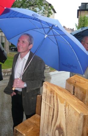 Schweinfurts Kulturamtsleiter Dr. Ernst Schneider hatte vor's ehemalige Sachs-Bad zum Preview vor der eigentlichen Vernissage geladen und konnte rund 30 beschirmte ZuschauerInnen – und natürlich den Künstler höchstpersönlich - begrüßen.