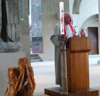 Anschließend fand in der sehr gut besuchten St. Johannis-Kirche, dem Kooperationspartner der städtischen Kunsthalle, die offizielle Eröffnung der Ausstellung „SäulenHeiligeMenschen“ statt. In Kirchenschiff, Chorraum und in den Seitenkapellen werden zwölf Holzexponate Kuhnleins präsentiert. Dekan Oliver Bruckmann, der bereits in seiner Deggendorfer Zeit eine Werkschau dieses „großen Gegenwartkünstlers“ „mit unverwechselbarer Handschrift“ initiiert hatte, führte in dessen Schaffen ein: Er halte uns kritisch einen Spiegel vor und bringe uns dadurch in Bewegung. Zwar sei er kein Kirchenkünstler, doch seine Kunst in der Kirche auch als Mittel der Verkündigung zu verstehen.