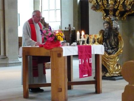 Es folgte die Feier des Heiligen Abendmahls, vom „Hausherrn“ Pfr. Stefan Stauch eingesetzt „als Vergewisserung, dass wir auf unserem Weg nicht allein sind.“ Im Altarraum waren viele lächelnde Gesichter zu sehen. Andächtige Stimmung herrschte, als die alten Choräle „So nimm denn meine Hände“ und „Großer Gott, wir loben dich“ angestimmt wurden.