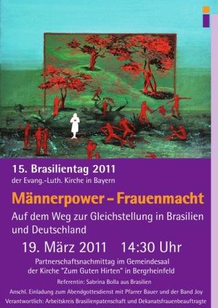 Bergrheinfeld, 19. März 2011. Der Nachmittag im Gemeindehaus der Kirche „Zum guten Hirten“ bot gleich mehrfachen Anlass zum Nachdenken und Diskutieren. Einerseits wurde auf den 8. März zurückgeblickt, an dem auch in Schweinfurt der 100. Internationale Frauentag, korrekt: der Tag der Vereinten Nationen für die Rechte der Frau und den Weltfrieden, begangen worden war. Andererseits wurde vorausgeblickt auf den 26. März, wo in Augsburg der 15. Brasilientag der Evangelisch-Lutherischen Kirche in Bayern stattfinden wird. Von daher hatten sowohl die Frauenbeauftragten als auch der „Arbeitskreis Brasilienpartnerschaft“ unseres Dekanates gemeinsam zu einem Brasilienpartnerschaftstag nach Bergrheinfeld eingeladen. Reißerisches Thema: „Männermacht und Frauenpower. Auf dem Weg zur Gleichstellung in Brasilien und Deutschland“!