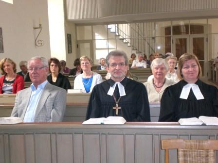 | Kirchenpräsident Dr. Nestor Friedrich mit Pfrin. Dr. Strelow am Morgen in St. Salvator; im Hintergrund links außen: Landessynodalin Renate Käser, zugleich die Dekanatsbeauftragte für "Mission, Partnerschaft, Entwicklung" (Foto: Medwedew) |