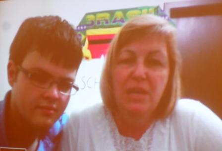 Pfrin. Dr. Strelow mit ihrem Sohn Wagner bei der Livebild-Konferenz zwischen Schweinfurt und Pommerode "Nacht der offenen Kirchen Schweinfurt" 2. Okt. 2011