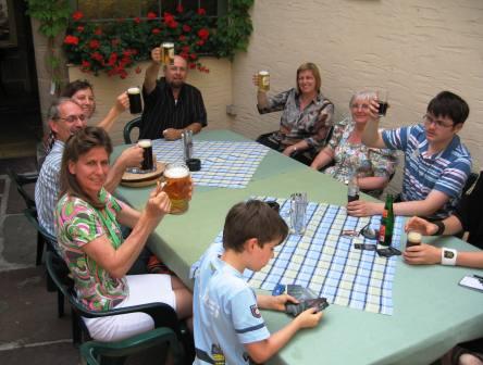 Nach dem Sprichwort „Essen und Trinken hält Leib und Seele zusammen“ nehmen wir unser Mittagsmahl im „Grünen Baum“ ein. Bis zur geplanten Stadtführung bleibt noch eine heiße Zeit – drum lädt Frau Weinzierl ein zur Eisdiele, und jeder - ob Groß, ob Klein - sucht sich zwei Kugeln Eis als Erfrischung aus. Mit Herrn Schmidt von den Altstadtfreunden haben wir einen sehr kompetenten Stadtführer. Er geht mit uns in die Hinterhöfe, zeigt uns die alten Fachwerkhäuser, erzählt von dem einst guten Zusammenleben von Juden, Katholiken und Protestanten. Stolz zeigt er uns die Attraktion Fürths: mitten in der Stadt eine sechsköpfige Storchenfamilie auf dem Schlot. Wir spüren, er liebt seine Heimatstadt und er steckt uns an – auch wir sind angetan von der Altstadt Fürths. So führt er uns in das älteste Café, wo wir uns stärken, um die Führung bis zum Bahnhof fortzusetzen.