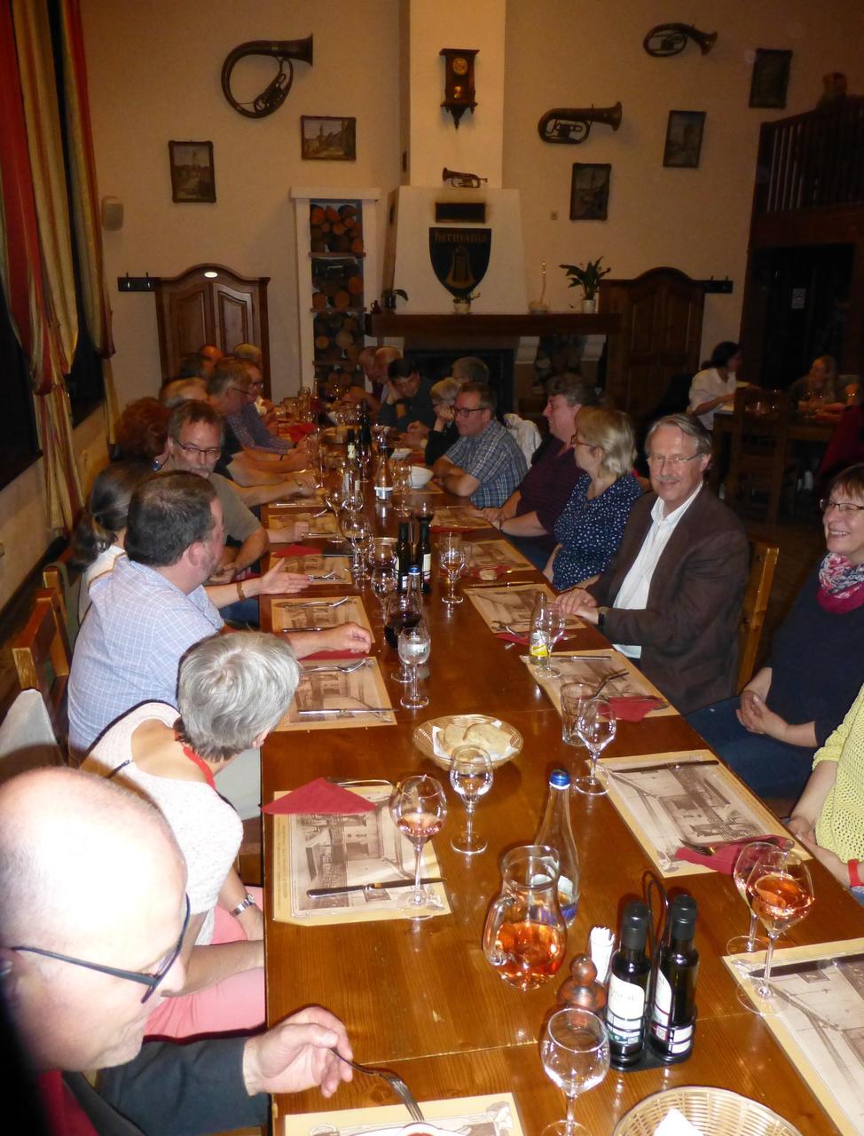 Am Abend ein imposantes Bild: 26 Leute an einer langen Tafel im gepflegten Restaurant „Hernandes“ - sozuÂsagen zwei Mal Jesus mit den Zwölfen, - die beiden Dekane obenan sitzend. Der frühere Barocksaal diente als Übungs- und Konzertsaal der Philharmonie. Deftige Mahlzeit à la carte mit viel Fleisch (T-Bone-Steak, Angus, Lammkotelett ...). Wer mit westlichem Gehalt ausgeÂstattet ist, braucht in Siebenbürgen keinen Hunger zu leiden, ja kann gar nicht so viel essen, um sein in neue rumänische Lei (RON) umgewechseltes Geld auszugeben. Wer 20 Euro berappen muss, ist wirklich mehr als satt. Dem Dekanat sei für die Einladung gedankt.